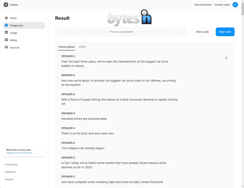 We tried using Gladia for a YouTube video we picked at random. The chosen video was 14 minutes long, and it talked about a possible car market crash in the next months. Not a surprising video, but what was surprising was the speed of Gladia converting the video to text. It took the application 42 seconds to transcribe that video to text…and it did a very good job. It wasn’t a very complex video, and the voice was a narrator that spoke pretty clear, most of the time. However, it was pretty impressive.