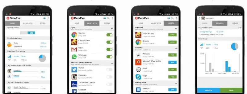 DataEye helps users control data usage, monitor each app, and block background usage. It also lets users unblock apps. If you’re looking for extra savings, DataEye gives access to great offers like free apps.